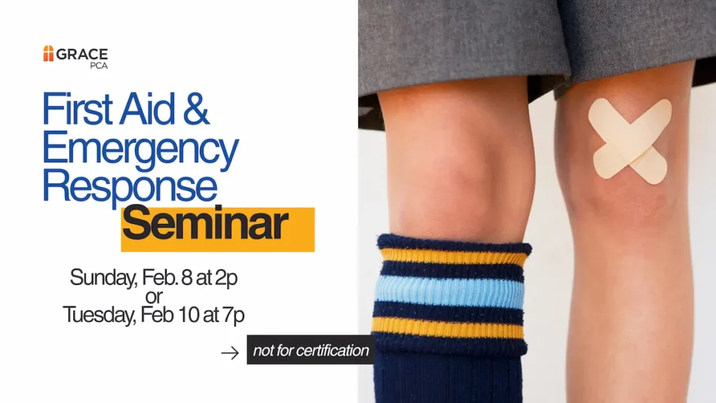 This training* is designed to support you as you work with a group of children, teens, or adults in any setting. Craig Branstrom, a retired first responder, will lead this one-hour seminar which teaches initial response to emergency situations such as rendering first aid, clearing airway obstructions, CPR, basic wound care, and more. Both sessions are identical (so choose the time that’s best for you), free of charge, and offered to any Grace members or regular attenders.